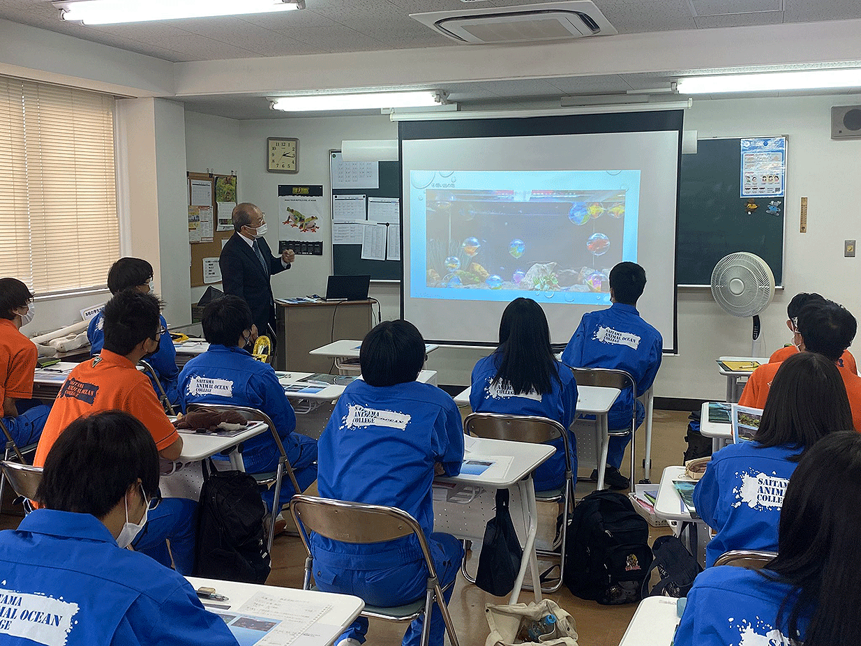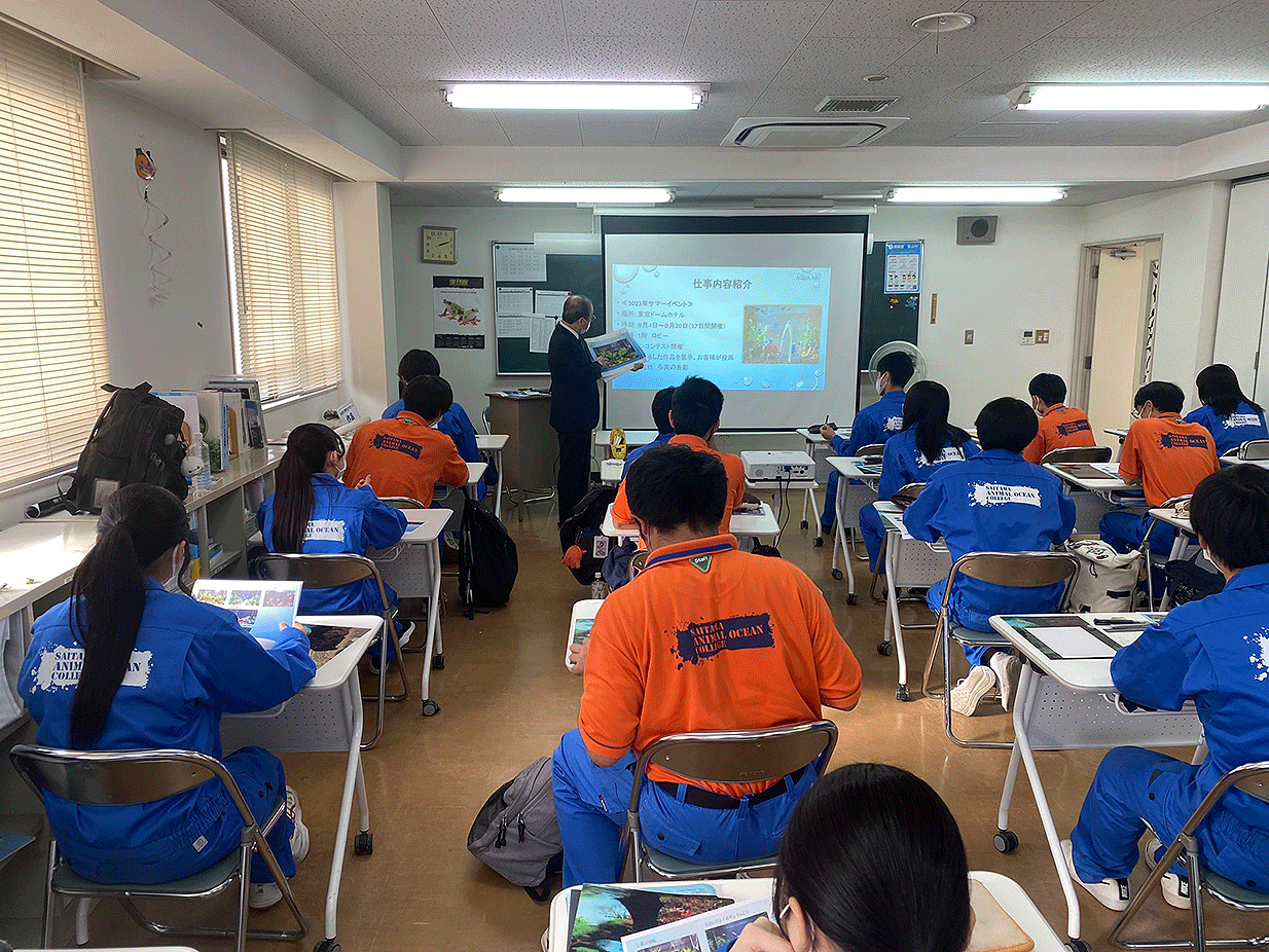 海洋生物飼育学科の特別講義でアクア・アート株式会社さんに来ていただきました。水槽メンテナンスの仕事の話やレイアウトコンテストの話など多岐に渡り話をしてもらいました。