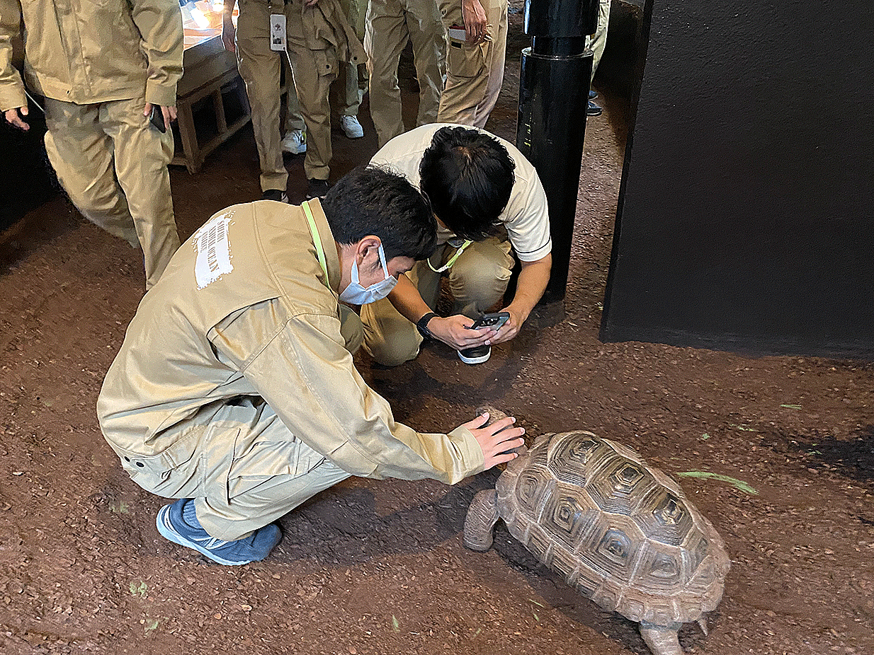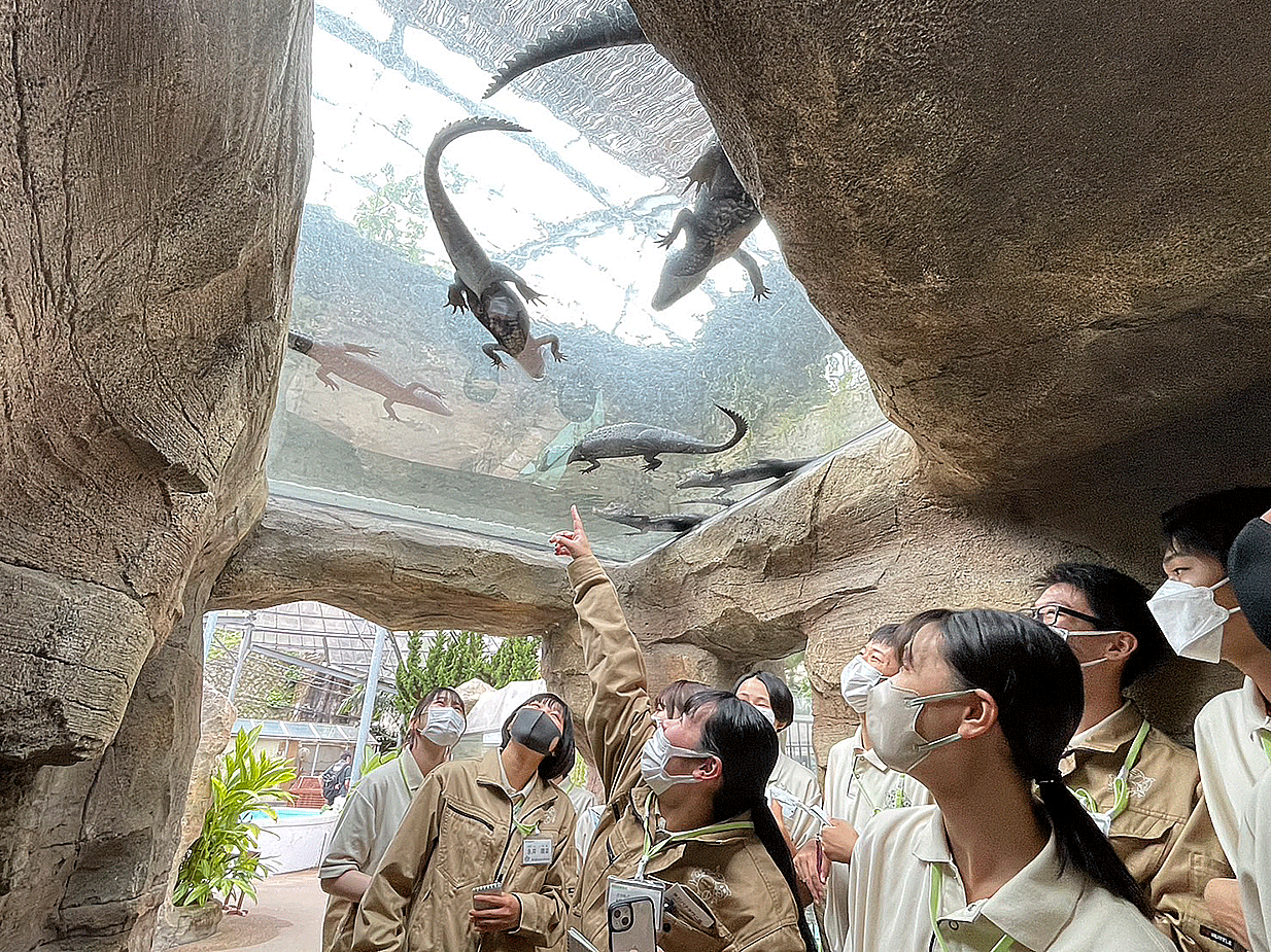 爬虫類の展示に特化した施設内を見学し、レイアウト方法や飼育管理について学びました。