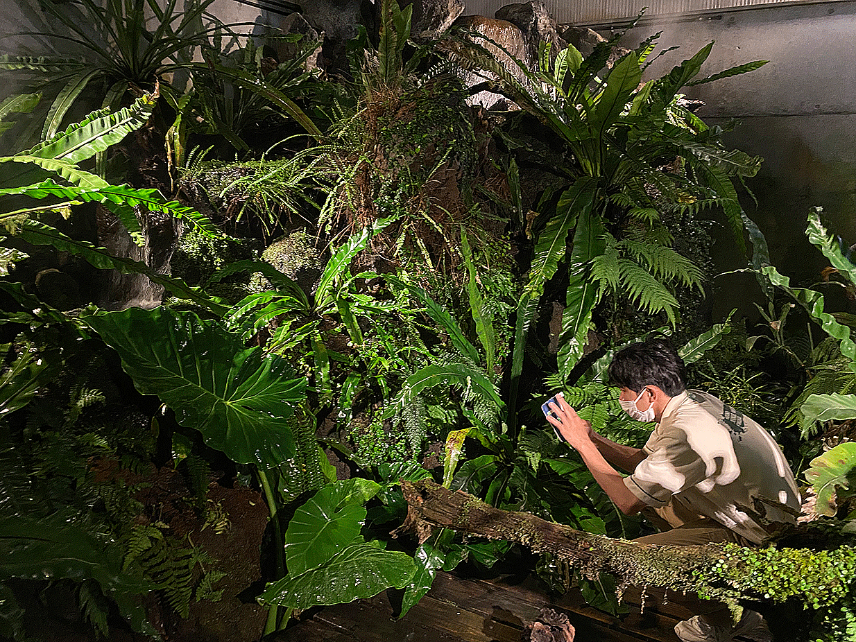 カエルの展示に特化した施設内を見学し、レイアウト方法や飼育管理について学びました。