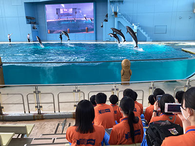園内見学では、生き物の飼育方法や展示の仕方を学びました。イルカショーを見学した後、本校の卒業生たちによるレクチャーをしていただき、水族館の役割や飼育員の仕事について学びました。