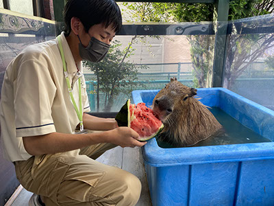 割ったスイカは、動物たちと学生たちみんなで食べて、夏を満喫しました。
