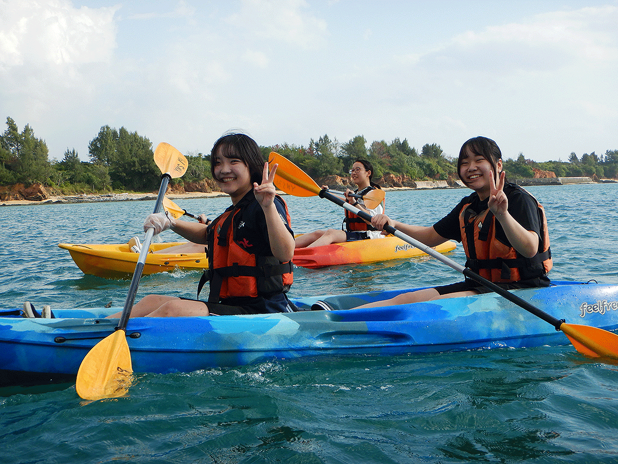 3日目の前半は、やんばる自然塾へ。やんばる自然塾では、卒業生のガイドのもと貴重な動植物も数多く生息している慶佐次川でリバーカヤックの体験、また、トレッキングを行いながら国指定天然記念物であるマングローブの観察や生物観察をしました。