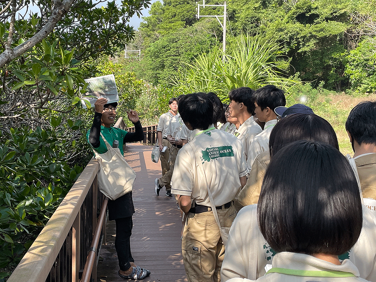 沖縄美ら海水族館では、館内見学の中で展示の工夫点、教育活動、裏側見学では、大水槽(黒潮の海)の上から回遊魚の見学と給餌方法を見学しました。またジンベイザメの搬入や水槽のシステムを見学しました。