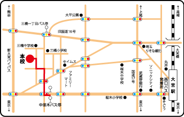 進行方向最初の信号を右折して頂き、次の信号を渡ったら左方向にお進み下さい。当校の案内看板がT字路の角に立っていますので、ここを右折して下さい。緩い傾斜の坂道を下り、交差点を過ぎて、そのまま進んで頂きますと左側に当校が見えて来ます。