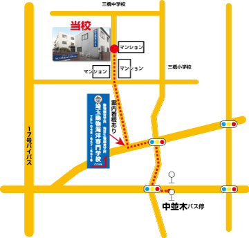 歩いてご来校頂く場合も、大宮駅西口からバス通りをまっすぐ進んで頂き、「中並木」バス停の先の信号を右折して上記の案内の様に進んで下さい。