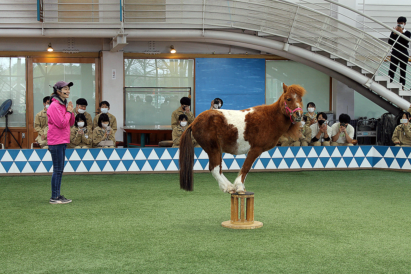 ハッピーポニーショーの見学、トレーニング方法や留意点について学びました。厩舎では、飼料の種類・馬房の特徴などをレクチャーしていただきました。