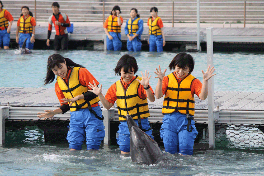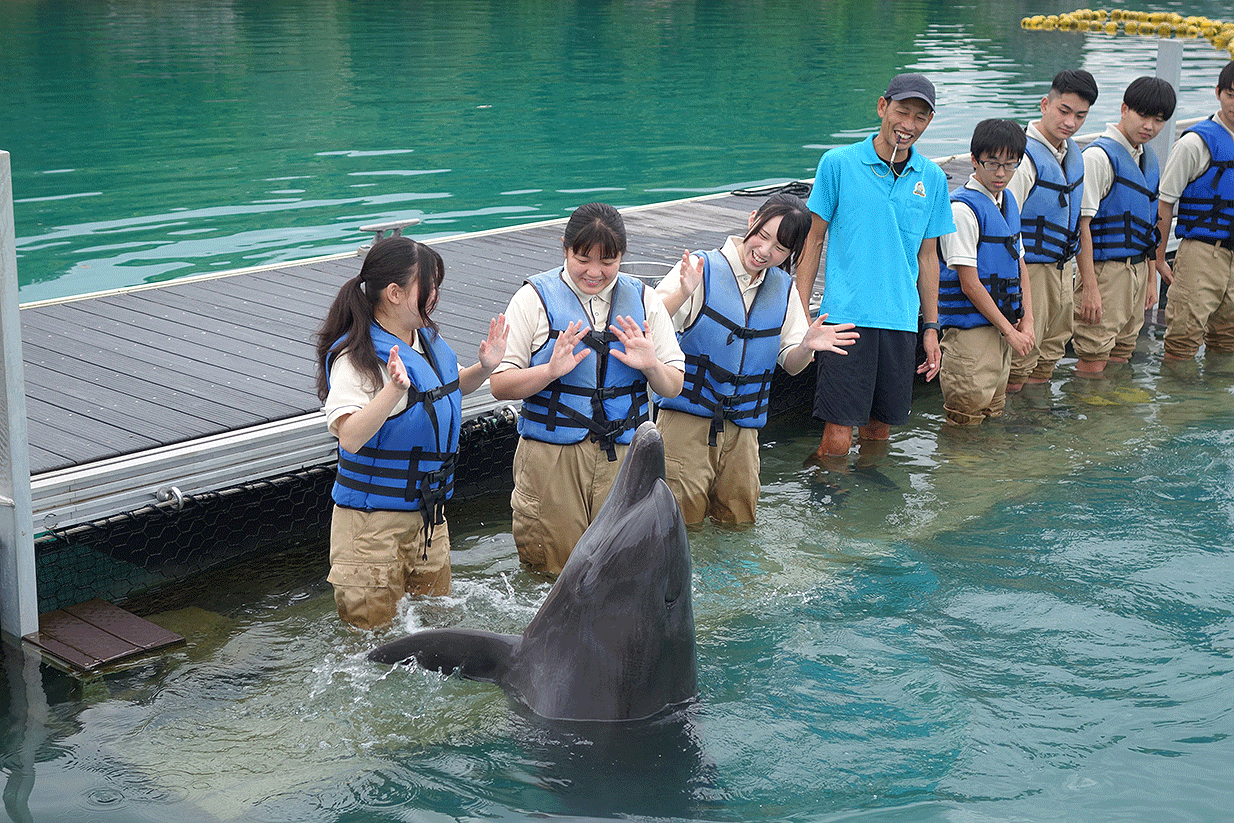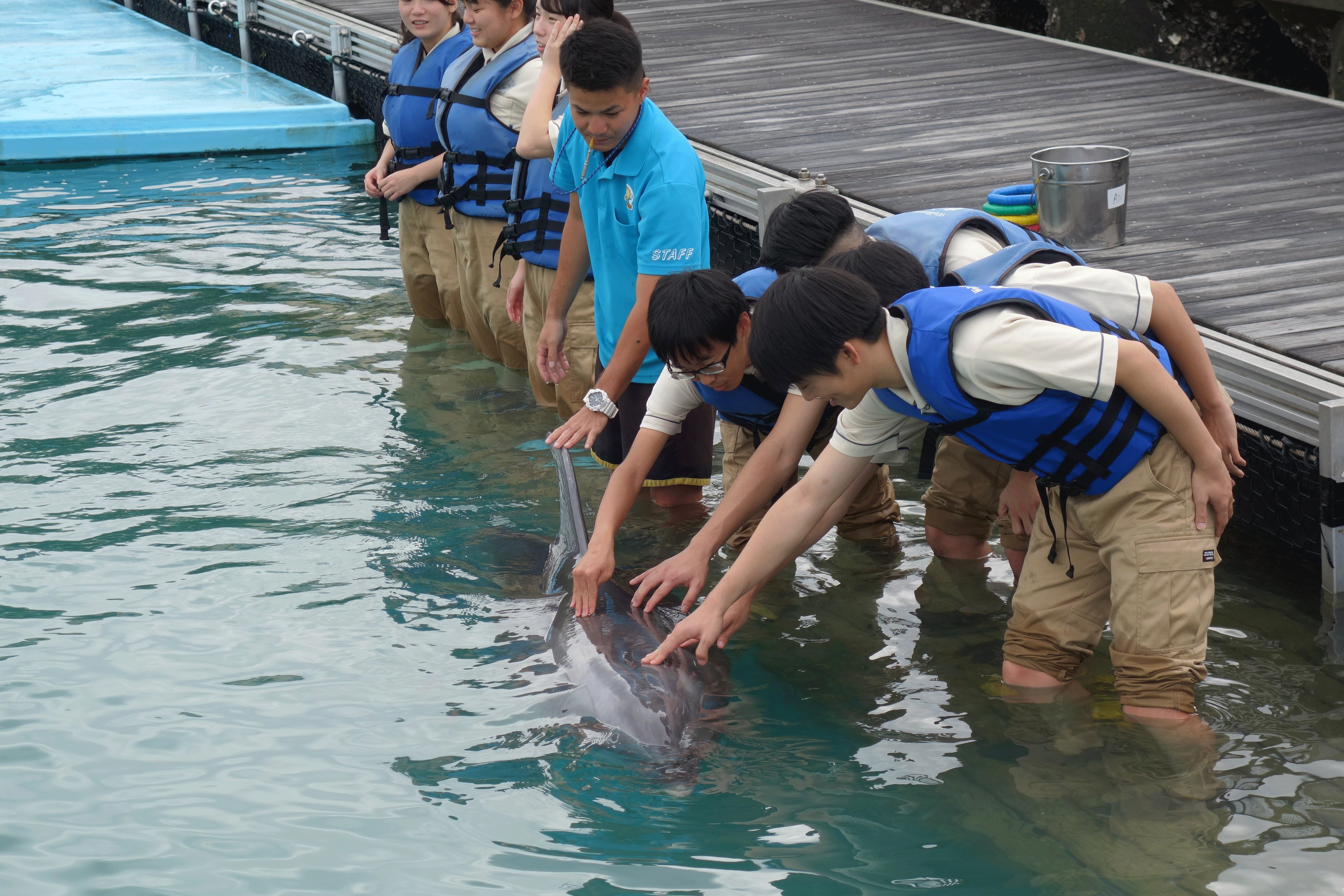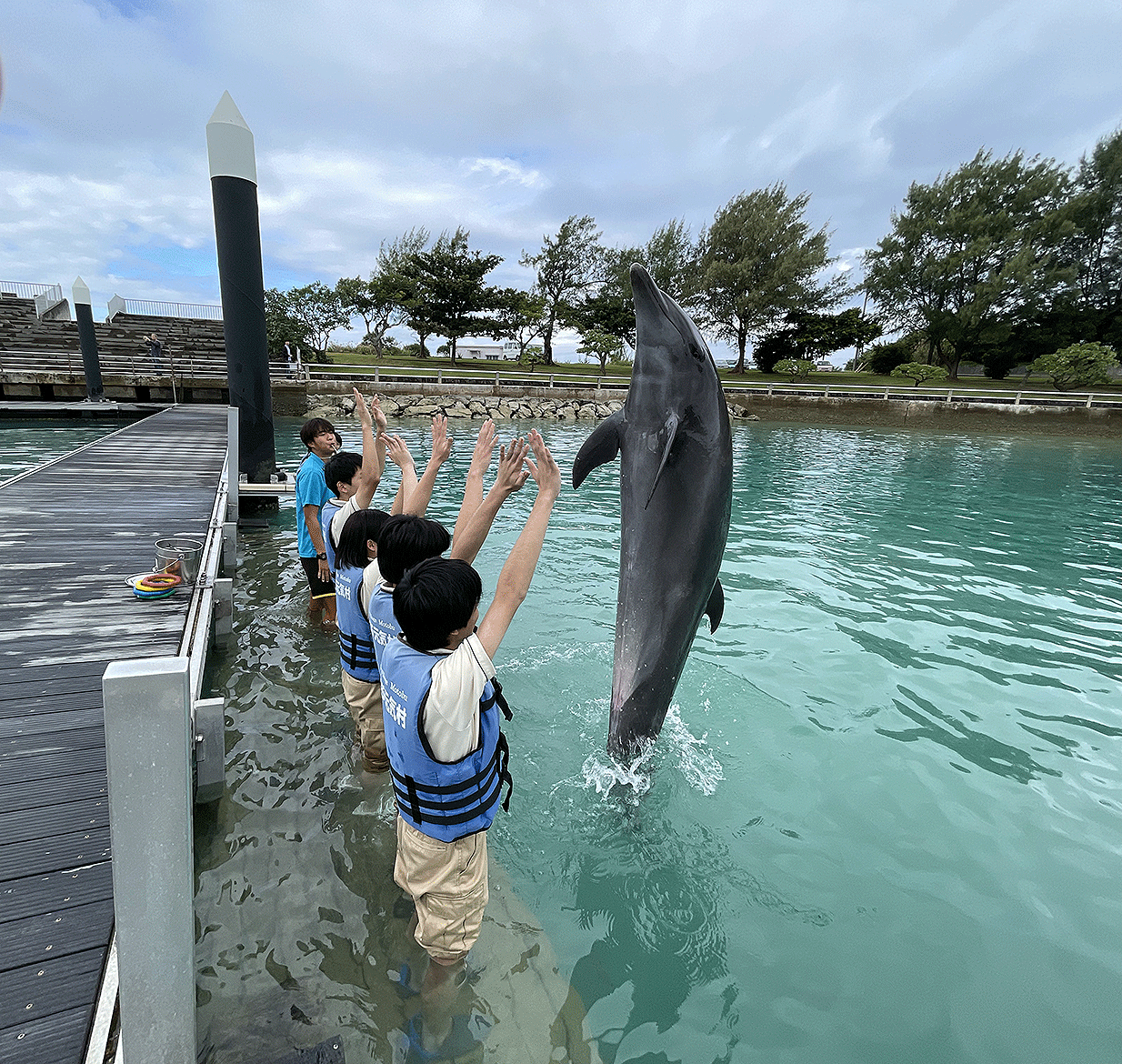 2日目の午前中はもとぶ元気村へ もとぶ元気村では、イルカについてレクチャーやトレーニング、ドルフィンアシステッドセラピーについて体験しながら学びました。