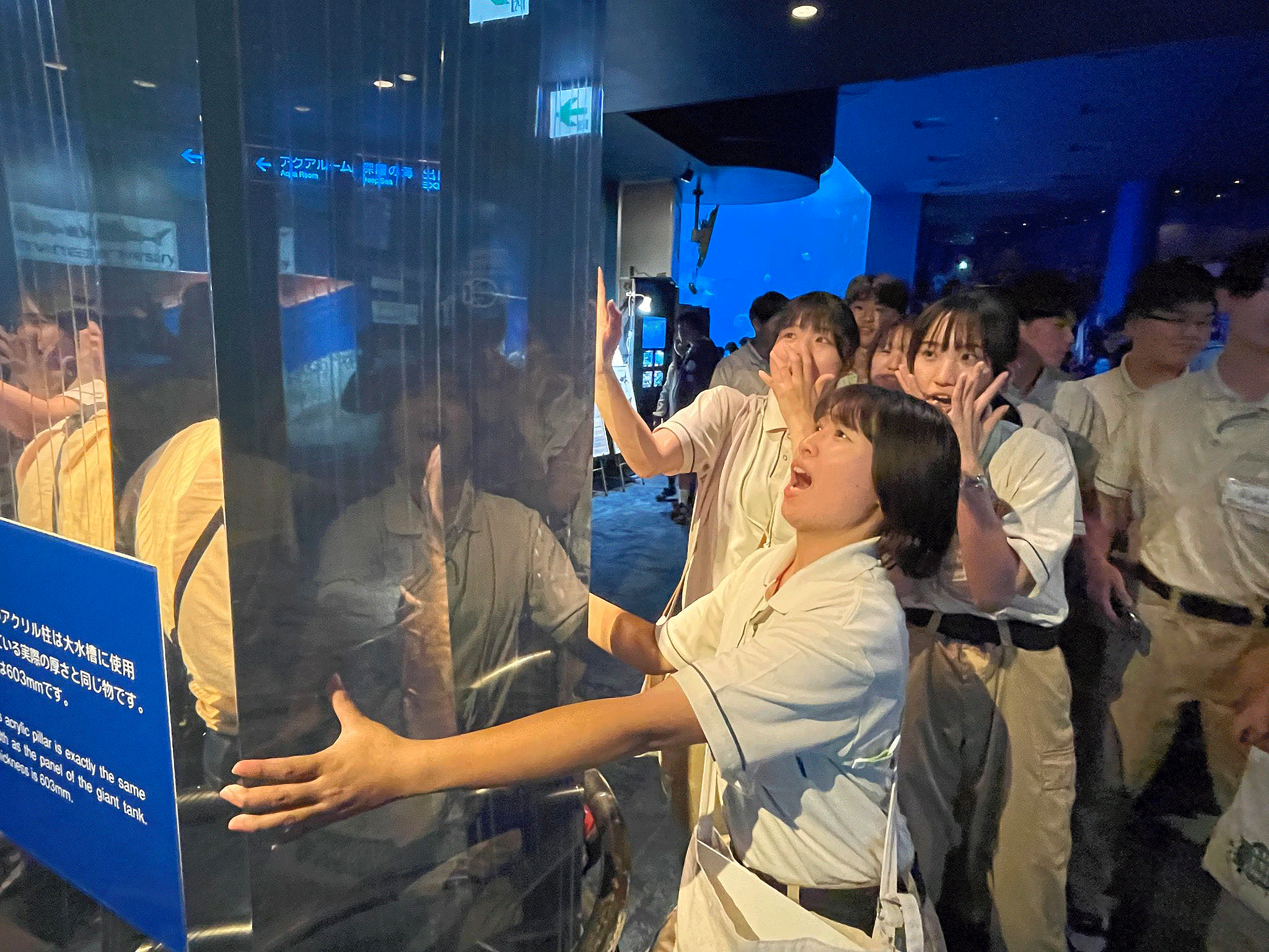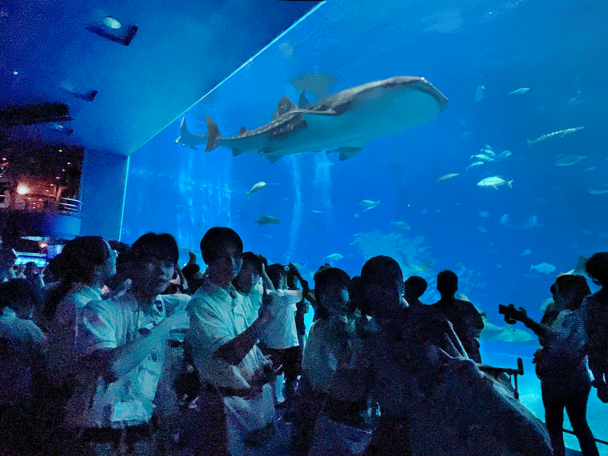 2日目の午後は、沖縄美ら海水族館へ 館内見学の中で展示の工夫点、教育活動、裏側見学では、大水槽(黒潮の海)の上から回遊魚の見学と給餌方法を見学しました。またジンベイザメの搬入や水槽のシステムを見学しました。