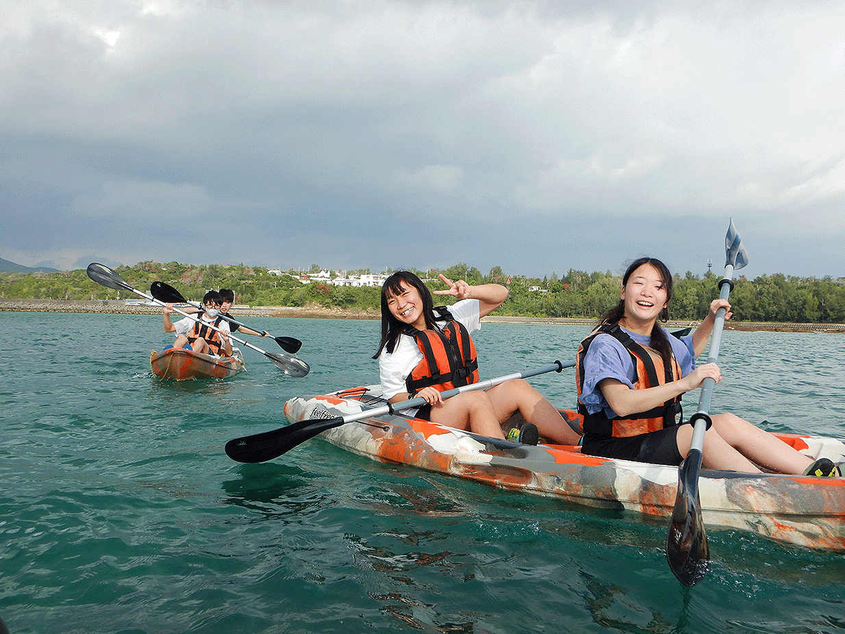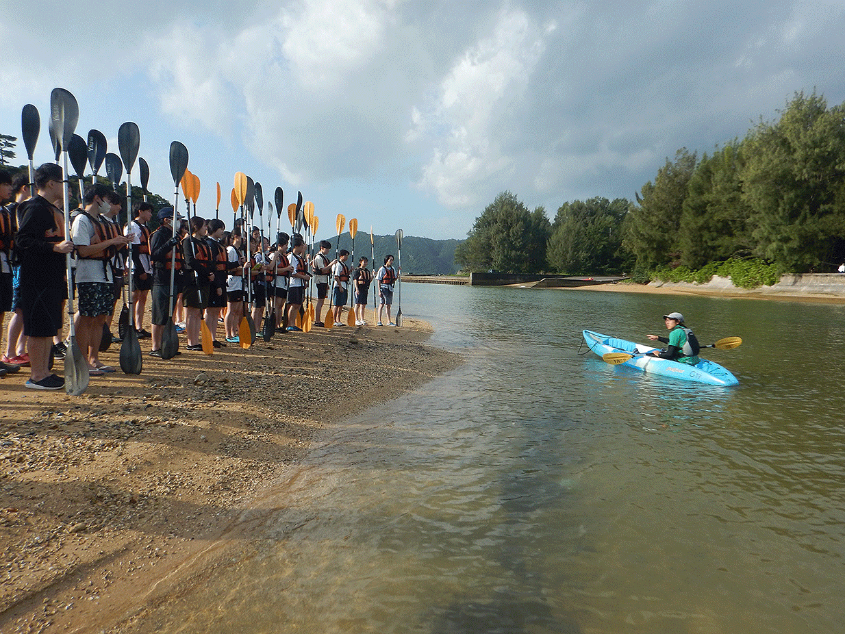 3日目の前半は、やんばる自然塾へ やんばる自然塾では、卒業生のガイドのもと貴重な動植物も数多く生息している慶佐次川でリバーカヤックの体験、また、トレッキングを行いながら国指定天然記念物であるマングローブの観察や生物観察をしましたた。