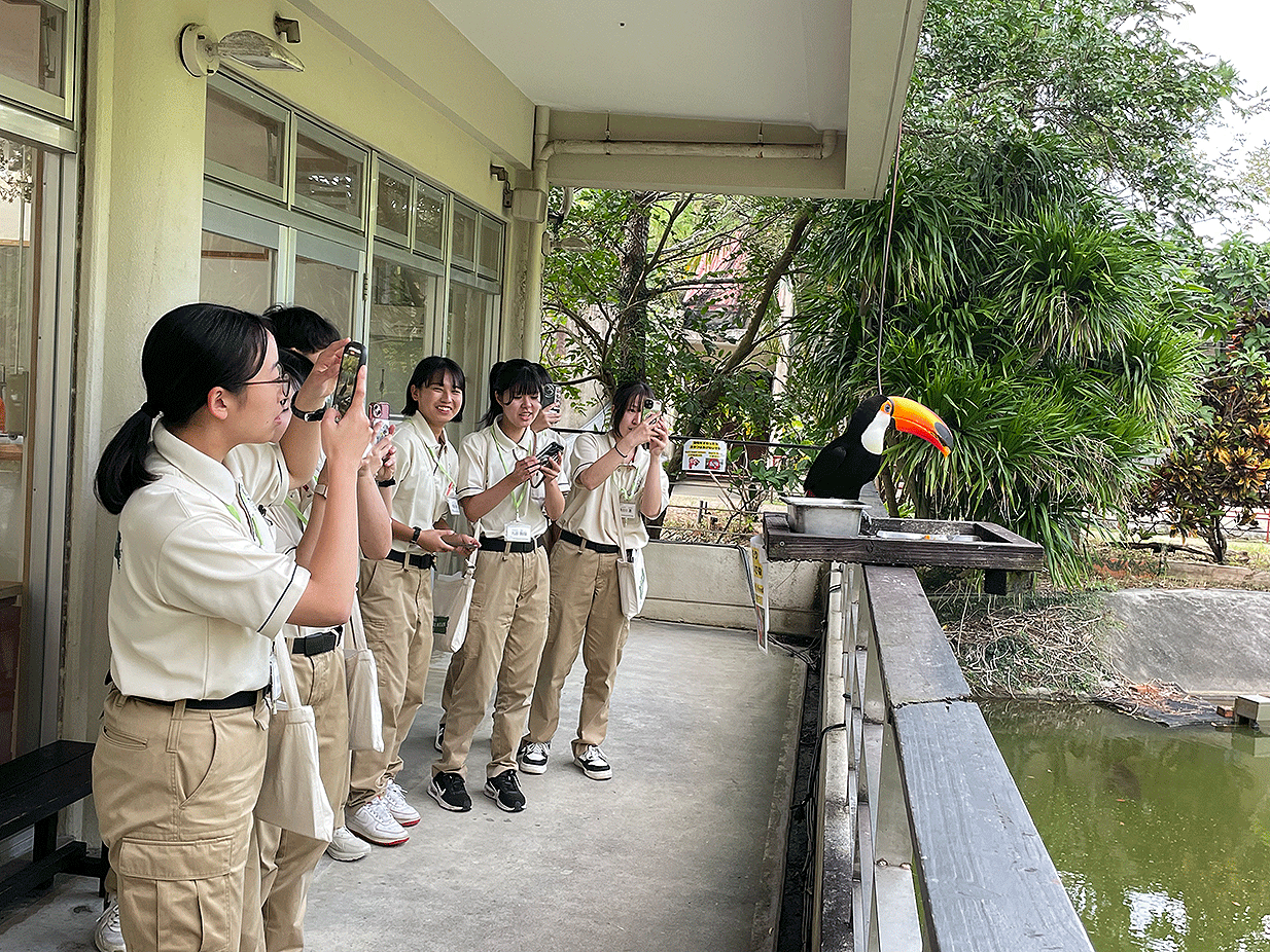 3日目の午後は、動物飼育学科はネオパークオキナワへ ネオパークオキナワでは「動物飼育業務」「ふれあい広場業務」「餌調達業務」の3班に分かれ、沖縄の気候に合わせた飼育管理について学びました。
